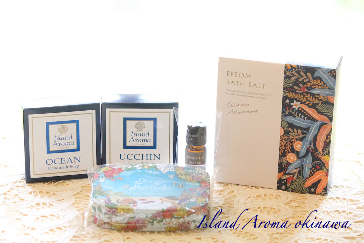 沖縄の海塩を配合したOCEAN石鹸に、海塩とハイビスカスパウダーをブレンドしたお料理にお使いいただけるハーブソルト。そして、3種類の香りが楽しめるエプソムバスソルトセット。さらに、爽やかな森林の香りが楽しめるブレンド精油、しっとり洗い上がるUCCHIN石鹸をお入れしています。