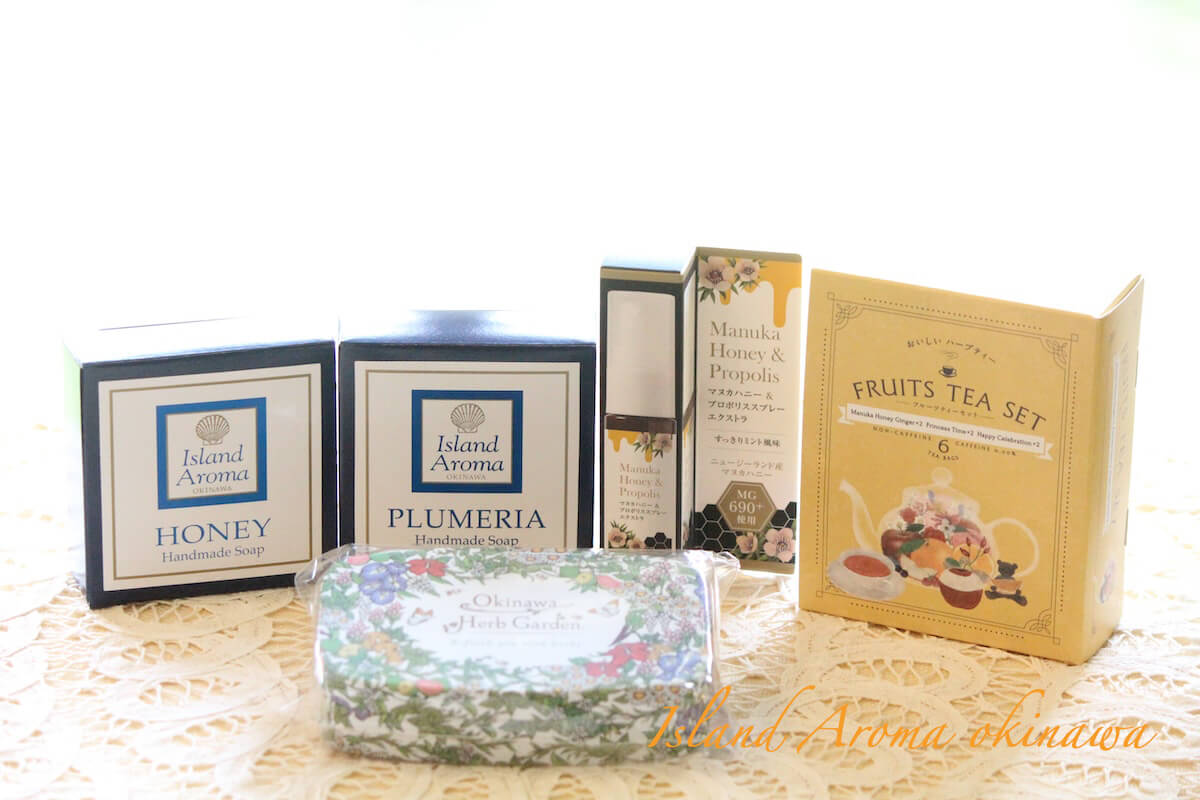 沖縄のはちみつを配合した石鹸に、マヌカハニー&プロポリスのスプレー。そして、マヌカハニージンジャーのハーブティーもセットされたフルーツティーセット。さらに、のどを潤すシークヮーサーハーブキャンディ、保湿の高いPLUMERIA石鹸をお入れしています。